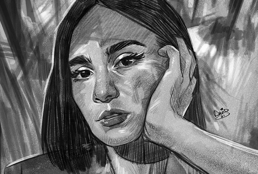 Watch this video to get started rendering hair in values- the example here is a beard, but the techniques are applicable to hairstyles too.