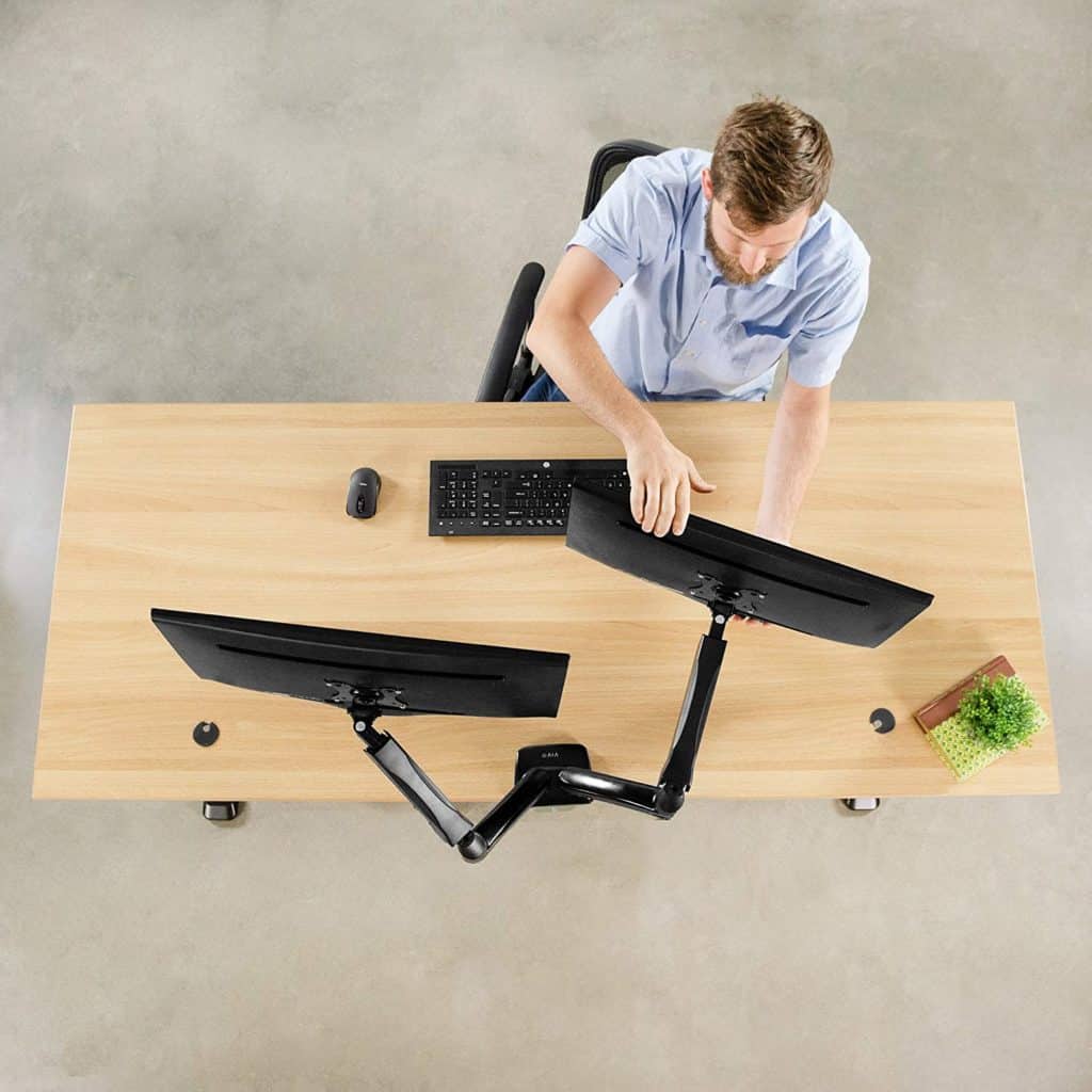 This changed the game for teammate Raven’s digital painting setup: monitor arms! “This opens up a lot of space on your desk and allows you to move the monitors to your pleasure- with great cable management!” Monitors can be placed in portrait or landscape position.
